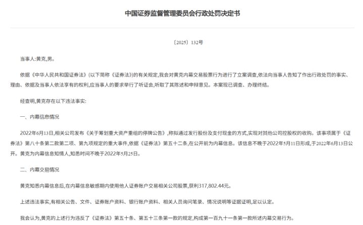 另一张罚单的当事人是黄克。行政处罚书显示,黄克在知悉内幕信息后,在内幕信息敏感期内使用他人证券账户交易相关公司股票,获利31.78万元。