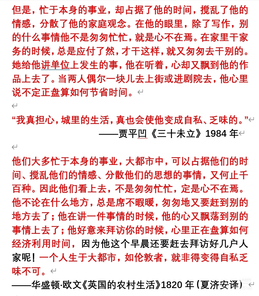 与美国作家华盛顿·欧文出版于1820年的散文《英国乡村》(夏济安翻译)中的句子高度相似,“他们大多忙于本身的事业,大都市中,可以占据他们的时间、搅乱他们的情感、分散他们的思想的事情,又何止千百种。因此他们看上去,不是匆匆忙忙,定是心不在焉。他不论在什么地方,总是席不暇暖,匆匆地又要赶到别的地方去了;他在讲一件事情的时候,他的心又飘荡到别的事情上去了;他好意来拜访你的时候,心里正在盘算如何经济利用时间,因为他这个早晨还要赶去拜访好几户人家呢!一个人生于大都市,如伦敦者,就非得变得自私乏味不可。”