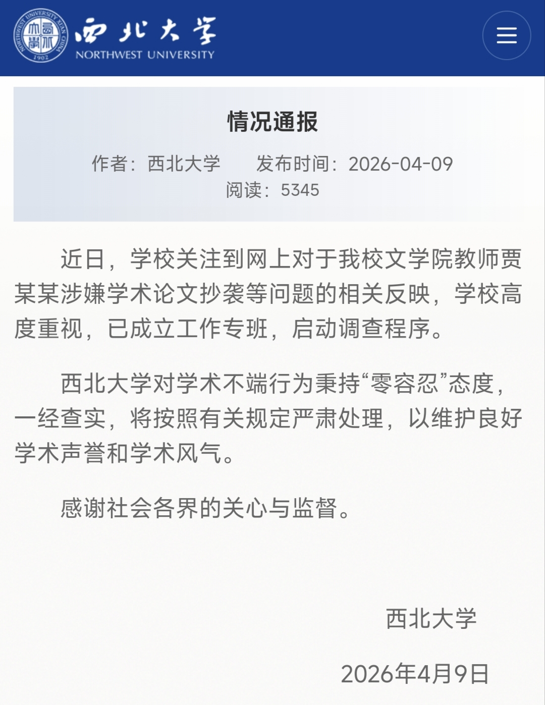 4月9日,西北大学发布情况通报,回应“贾浅浅涉嫌学术论文抄袭一事”。通报称,学校关注到网上对于我校文学院教师贾某某涉嫌学术论文抄袭等问题的相关反映,学校高度重视,已成立工作专班,启动调查程序。