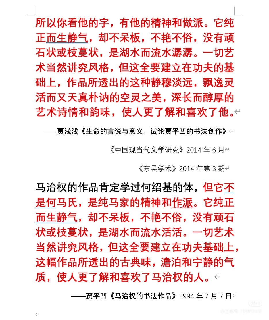 其中,2014年发表于中国作家协会主管的国家重点学术期刊《中国现当代文学研究》的《生命的言说与意义——试论贾平凹的书法创作》与贾平凹发表于1994年7月的《马治权的书法作品》存在段落重合。